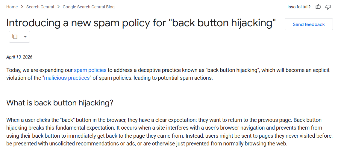 Se você utiliza táticas agressivas para reter o usuário no seu site, é melhor revisar seus scripts. O Google anunciou hoje (13 de abril de 2026) uma atualização importante em suas Políticas de Spam, mirando diretamente no Back Button Hijacking (sequestro do botão de voltar).