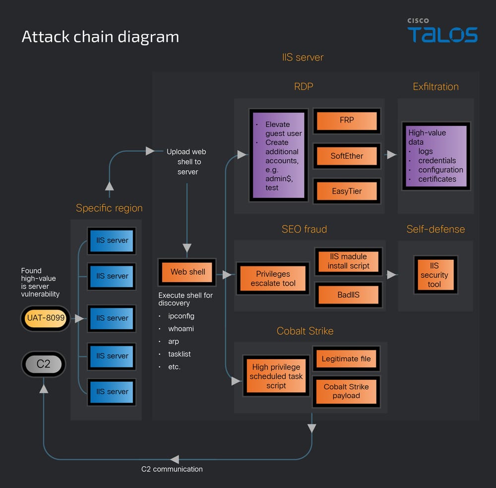Segundo Joey Chen, pesquisador da Cisco Talos, o UAT-8099 manipula resultados de busca explorando servidores IIS confiáveis e de alto valor. O grupo utiliza web shells, ferramentas open-source, Cobalt Strike e diferentes variantes do malware BadIIS, com scripts personalizados para escapar de defesas e ocultar atividades.