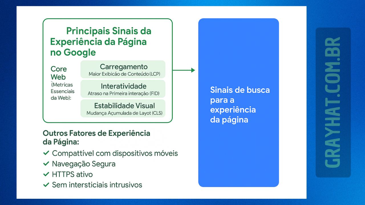 O Google usa a Experiência de Página como um sinal de ranqueamento, especialmente com foco nos Core Web Vitals – um conjunto de métricas que avaliam a performance de uma página em termos de velocidade, interatividade e estabilidade visual. Esses fatores ajudam a garantir que as páginas ofereçam uma experiência de qualidade e fácil acesso ao conteúdo, o que também melhora o tempo de permanência e a taxa de conversão.