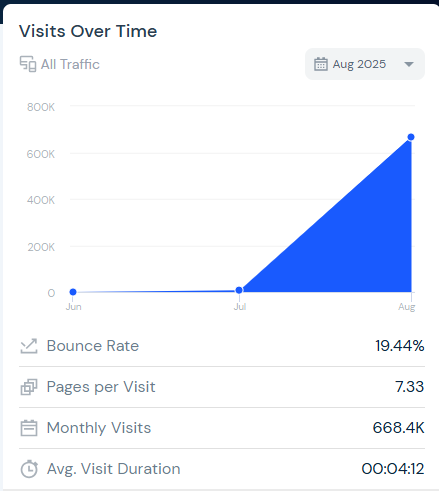 O dominio final usado para a prática de invasão teve um salto de 0 para algo próximo de 660 mil acessos mensais até agosto (calculado pelo Similarweb) com a permanência média de 4 minutos e 12 segundos, o que é uma taxa muito alta que pode ser o tempo de cadastro do usuário até acontecerem as apostas.