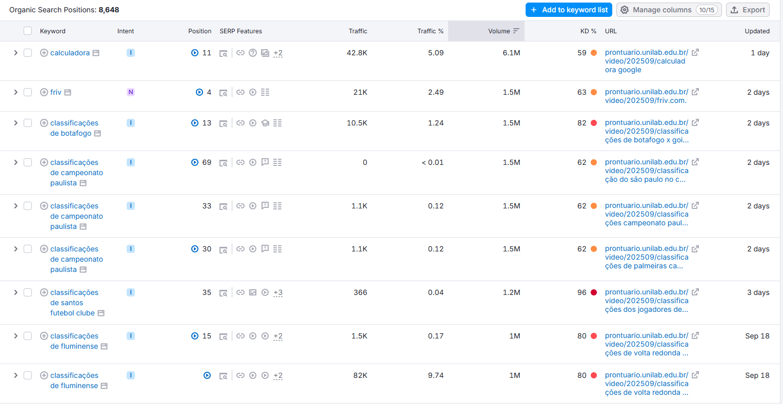 As palavras são randômicas, como o dominio tem grande autoridade perante o algoritmo do Google, ranqueiam rapidamente na primeira página e na maioria das vezes no primeiro lugar. Termos ligados ao futebol que convertem para casas de apostas são mais usados, porém muitas keywords do nicho pornográfico são usadas para reter ainda mais tráfego. Abaixo uma imagem demonstrando apenas 9 das mais de 8 mil variações de palavras chaves usadas pelo invasor no site em estudo.