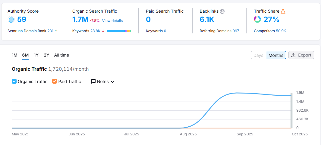 Segundo o semrush, o tráfego do domínio em questão - prontuario.unilab.edu.br - deu um salto para aproximadamente de 1 milhão e 700 mil acessos de agosto até o dia atual da imagem.
